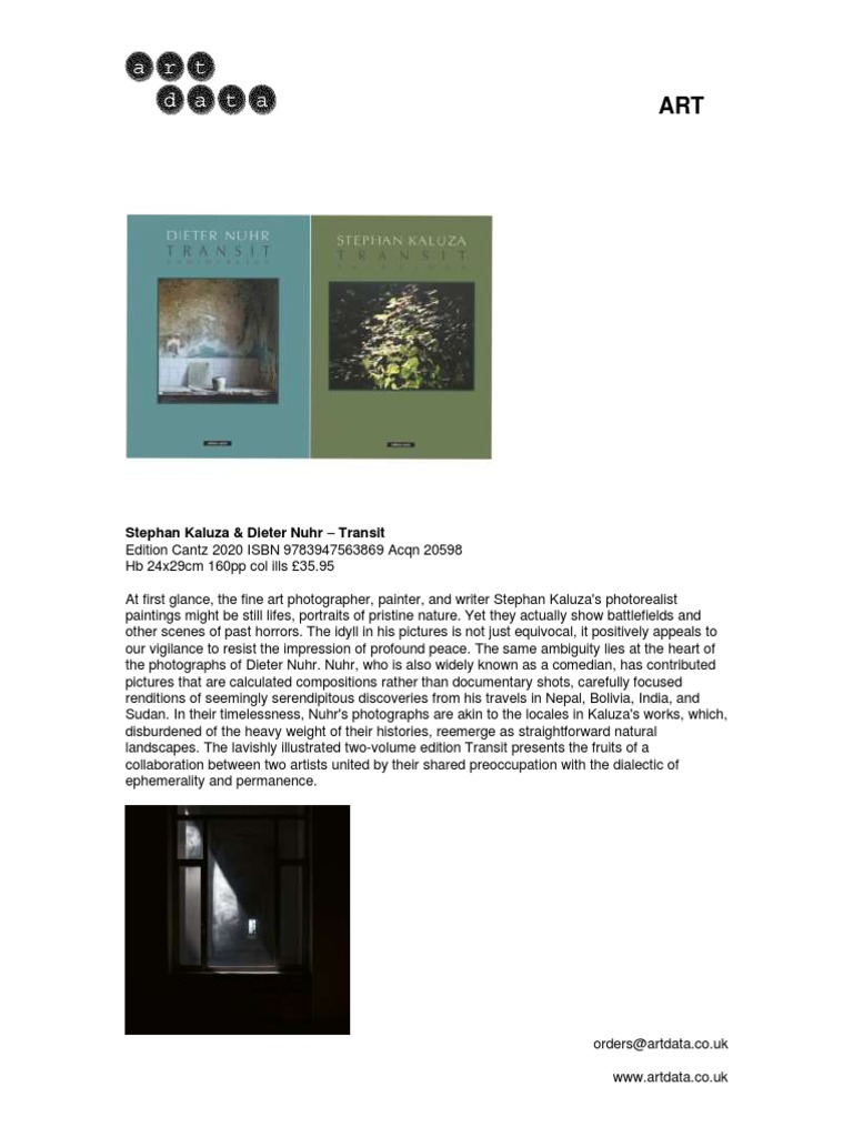 Dieter nuhr und kaluza. Dieter nuhrs bilder von orten interieurs und dingen des alltaeglichen lebens oft hinterlassene gegenstaende die auf den ersten blick wenig bildwuerdig erscheinen eroeffnen einen sachlichen und dennoch oft melancholischen blick auf die raetselhaftigkeit des daseins. Dabei naehert er sich der einheimischen pflanzenwelt und den gewaessern einmal auf abstrakte einmal auf naturalistische art und weise. In seinen beiden werkserien transit i und transit ii setzt sich kaluza der auch als autor und regisseur erfolgreich arbeitet mit dem thema natur auseinander.